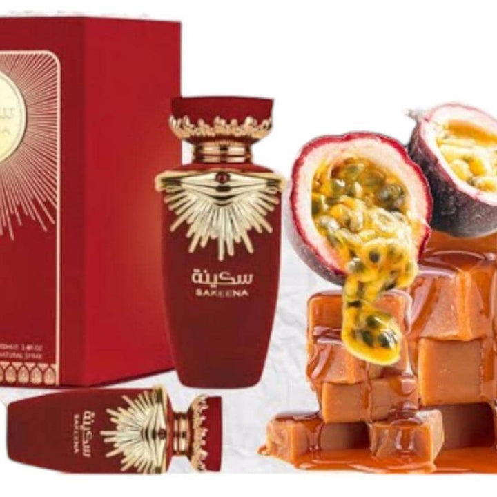 Sakeena by Lattafa Perfumes is a lush, feminine floral-fruity gourmand fragrance introduced in 2022. It opens with bright top notes of passionfruit, mandarin orange, and fresh ozonic accords, offering a refreshing and uplifting start.