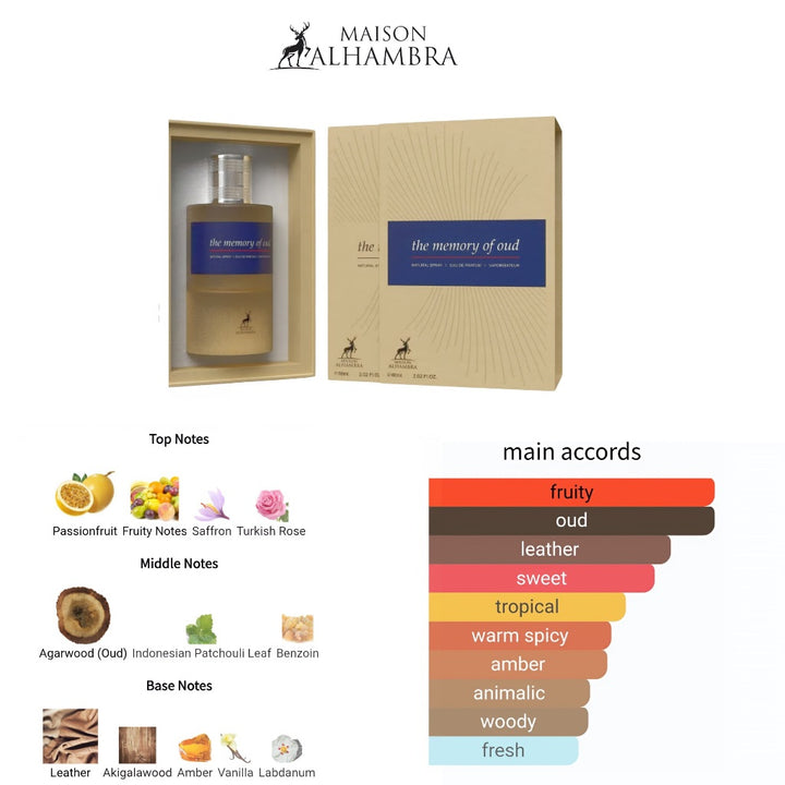 The Memory Of Oud menggabungkan rempah dan buah dengan oud yang mendalam. Permulaan sitrus-rempah diikuti nota rose, mate dan leather, kemudian kering ke sandalwood, vetiver, patchouli, oud Kemboja, amber dan musk. Sesuai dipakai siang atau malam.